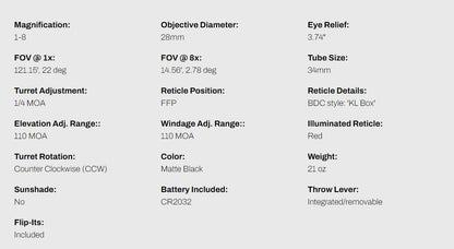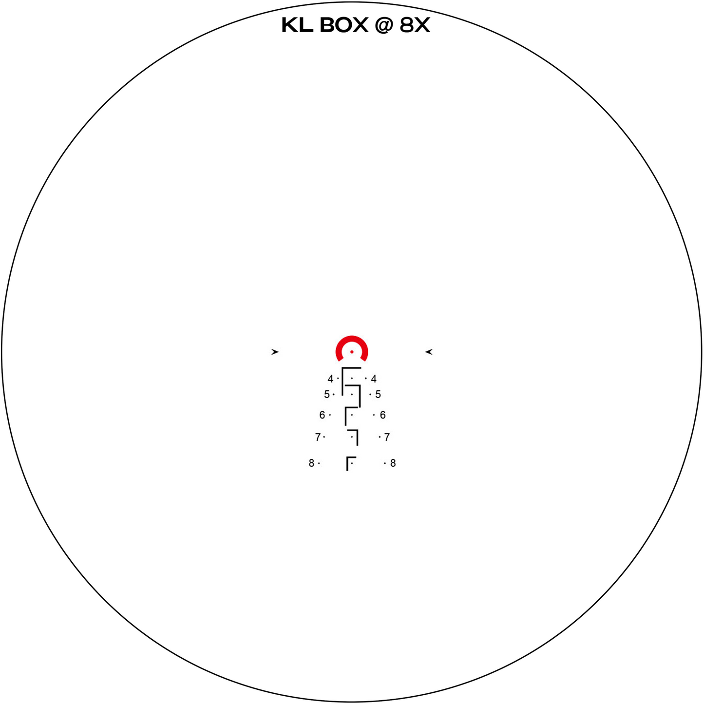 - Reticle Details: BDC (Bullet Drop Compensator) - KLBOX (see below)