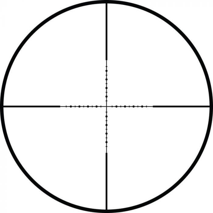 Designed to be exact at 10x. Multiple aim points for hold over and hold under. Between each dot is a dash for more choice when selecting an aimpoint.