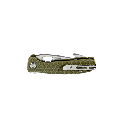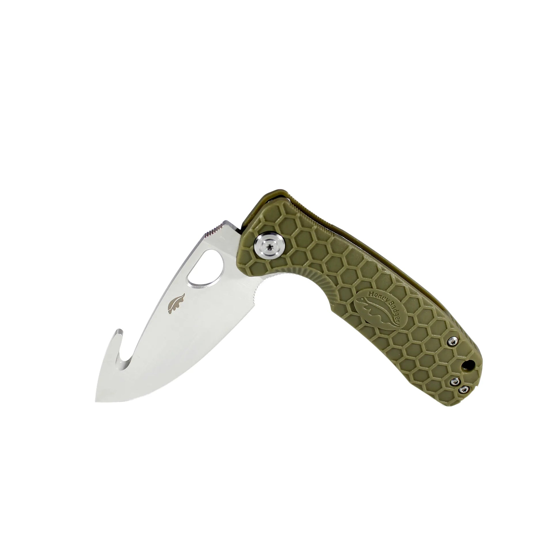 Technically, a gut hook is more of a blade feature as included on a blade, than a blade shape itself. Gut-Hooks usually appear as a small, sharpened hook-like curve that interrupts the spine as it slopes toward the point. These have one main use: field dressing wild game. The design of the hook allows hunters to cut through an animal’s skin without piercing or damaging what lies under it. Honey Badger’s specific gut-hook design features exactly the same cutting-edge profile as the drop point Flipper model, but with an added gut-hook for the field dressing of game.