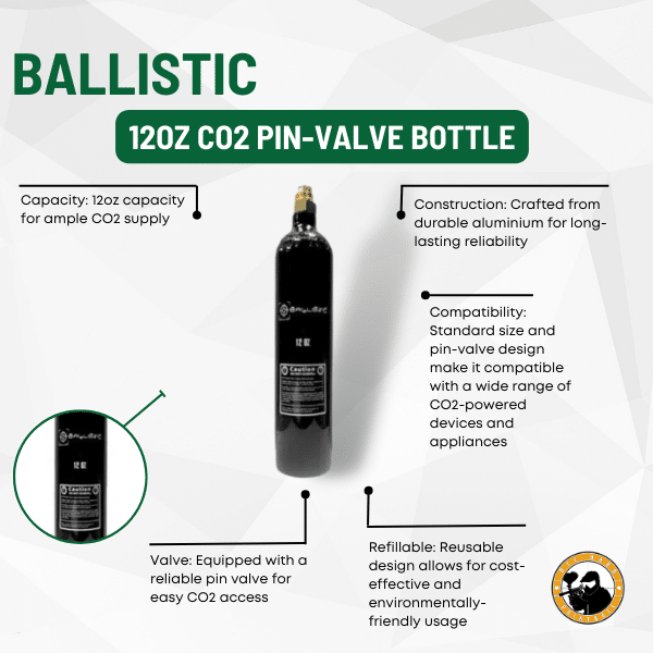 Ballistic 12oz CO2 Pin-Valve Bottle – Looking for a reliable and high-quality CO2 bottle to fuel your next project or activity? Look no further than the 12oz CO2 pin-valve bottle, a must-have for any CO2-powered device or appliance.
